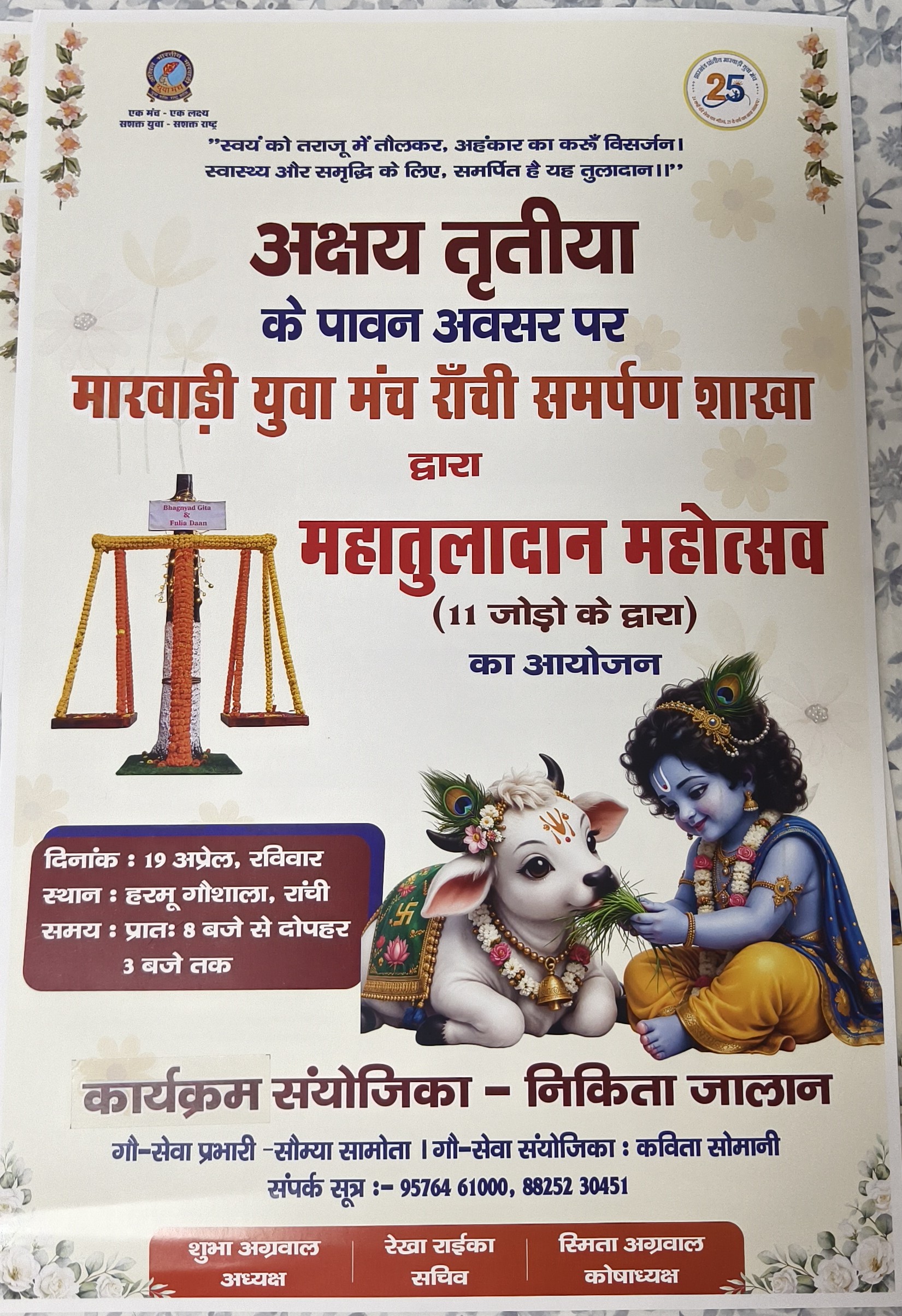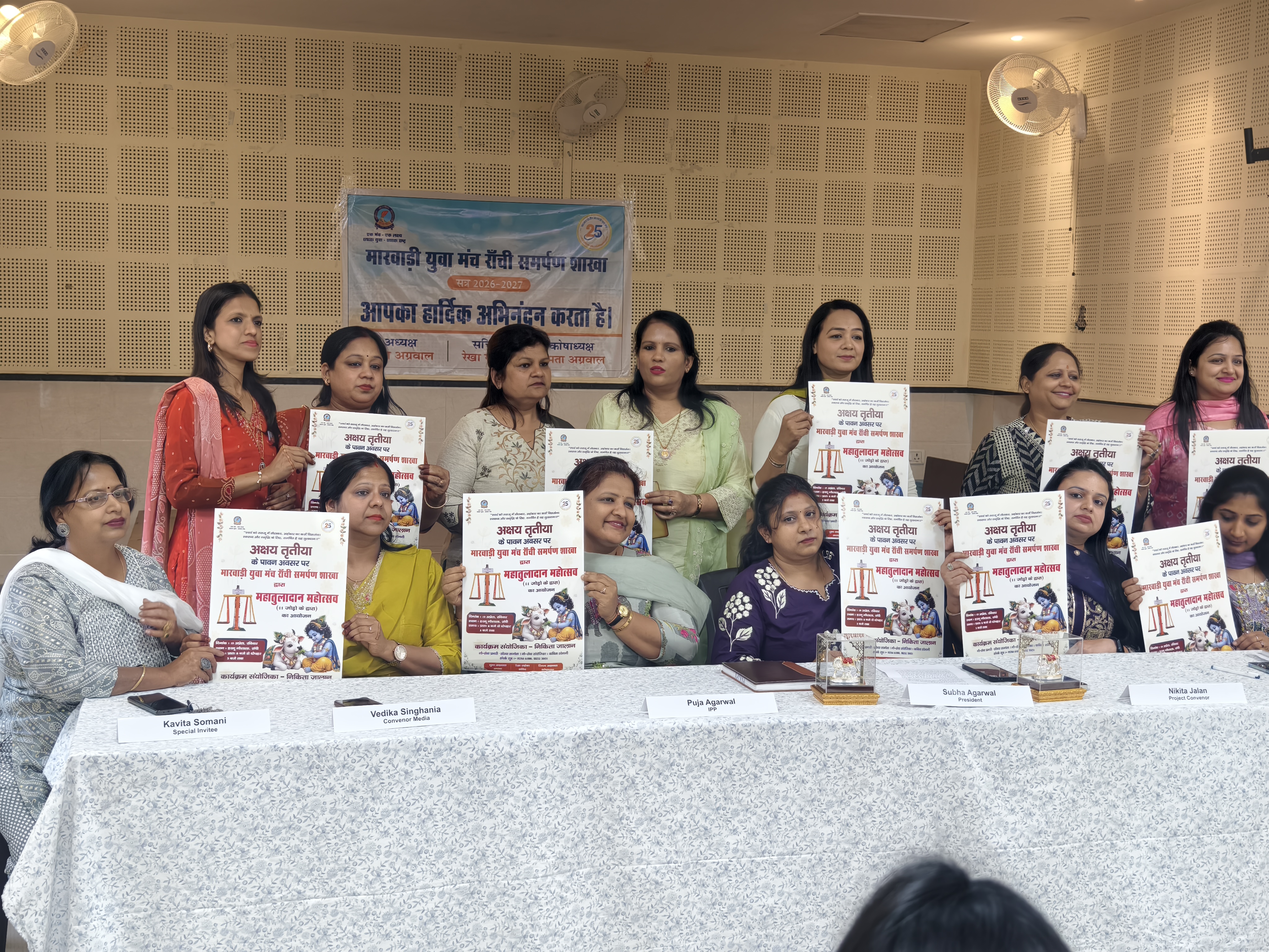 रांची: मारवाड़ी युवा मंच रांची समर्पण शाखा की ओर से इस वर्ष एक भव्य महातुलादान महोत्सव का आयोजन किया जा रहा है। शाखा अध्यक्ष शुभा अग्रवाल के नेतृत्व में नवगठित सत्र 2026-27 की कमिटी द्वारा यह विशेष आयोजन 19 अप्रैल, रविवार (अक्षय तृतीया) को रांची हरमू गौशाला में संपन्न होगा।